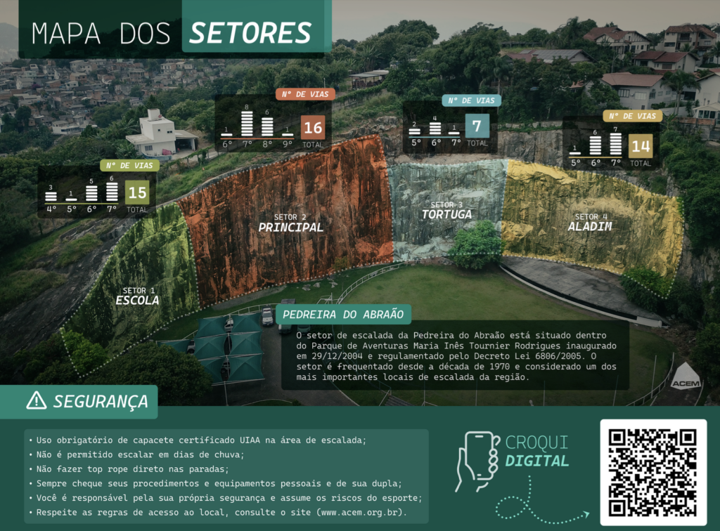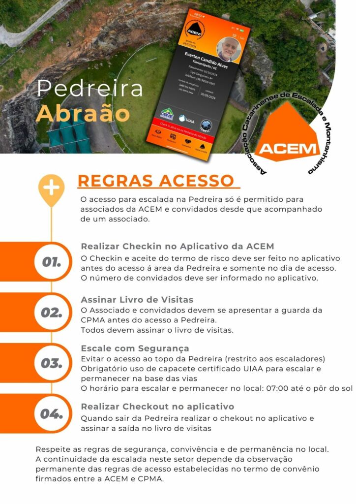 Todos sabem da importância que a Pedreira do Abraão tem para os escaladores de Florianópolis e região. O acesso ao parque foi conseguido por meio de muito esforço e dedicação dos escaladores e, principalmente, pelos membros da ACEM. Temos que trabalhar no sentido da manutenção e ampliação desse acesso por meio do cumprimento do convênio assinado com a Polícia Militar Ambiental e do uso responsável do setor.