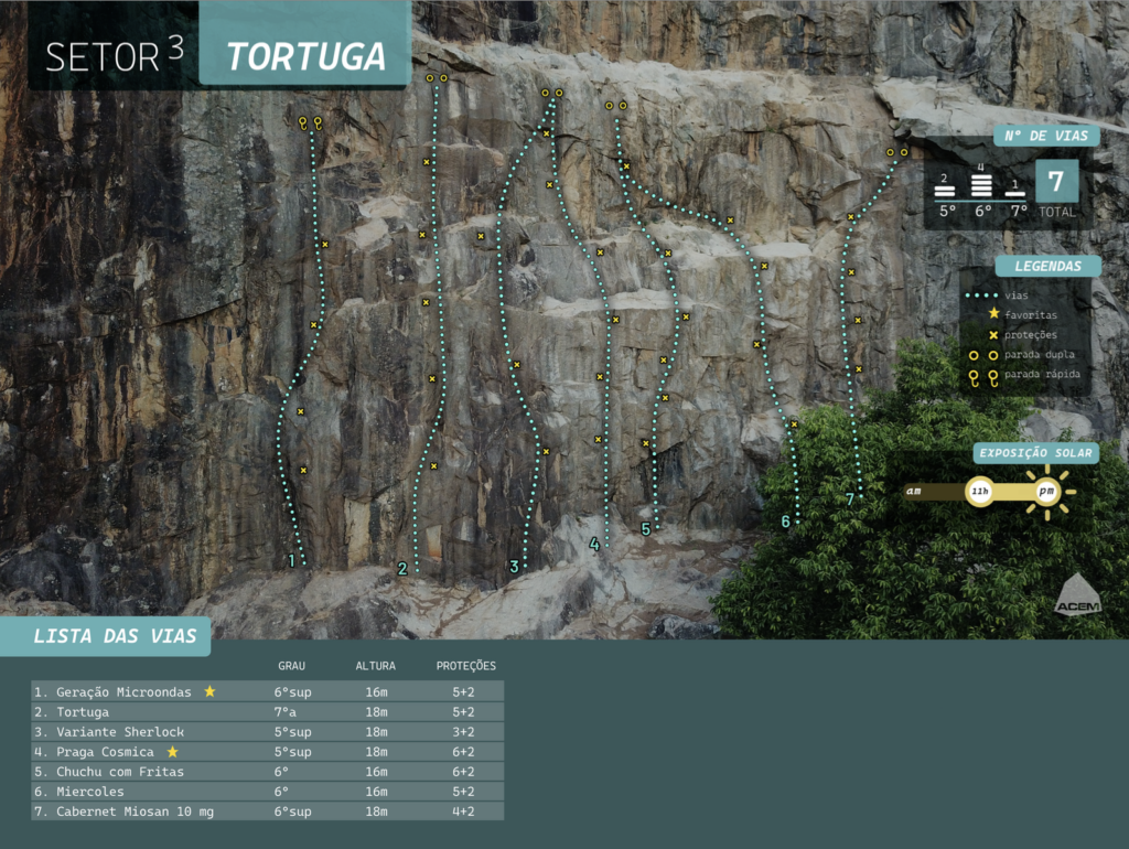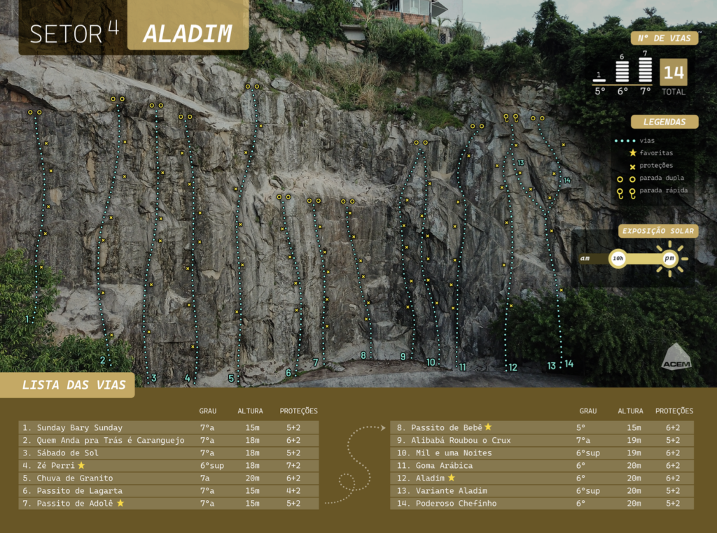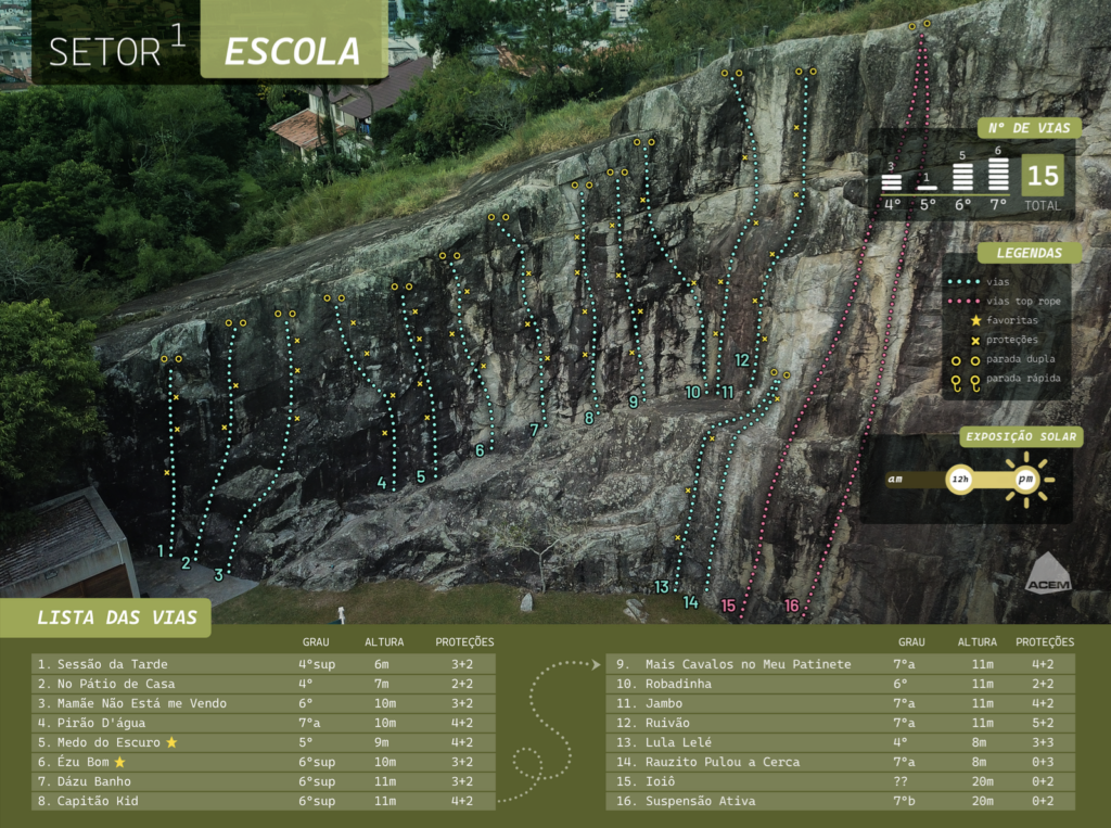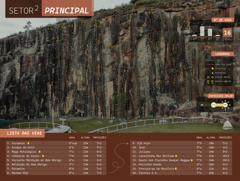Tenha especial atenção aos procedimentos de segurança. É obrigatório o uso de capacete de escalada, inclusive para quem está na base das vias. Qualquer pessoa sem capacete deve ficar fora do alambrado. Não utilize capacete de outros esportes. Não é permitido escalada solo. Não acesse o topo das vias quando a rampa estiver úmida.